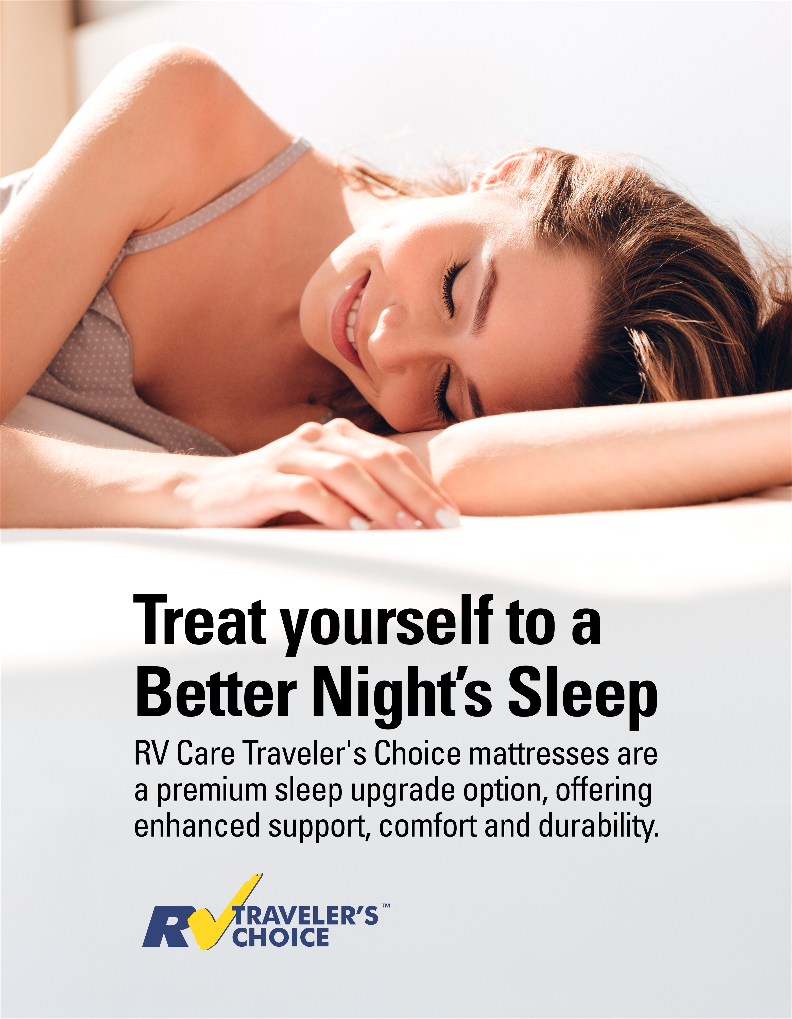 A great day on the road starts with a great night’s sleep. Most factory-installed RV mattresses are built to meet minimum standards, not maximum comfort. RV Traveler’s Choice Mattresses are designed specifically for RV living, delivering the added comfort and support most OEM mattresses simply can’t match. Available in two comfort options.