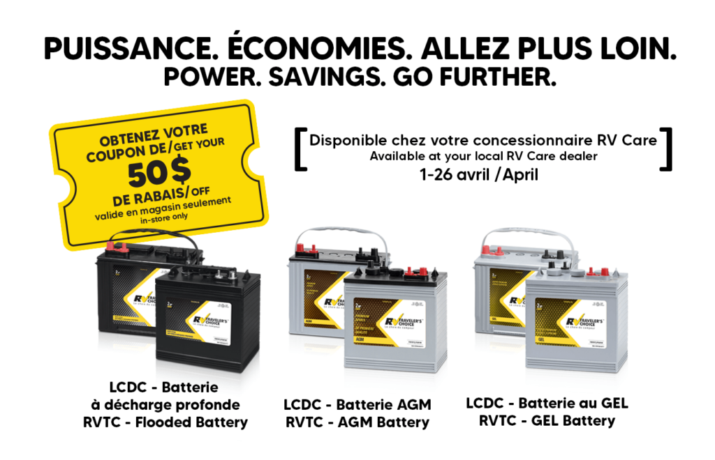 | *Offre valide sur achat en magasin seulement, chez les concessionnaires participants et jusqu’à épuisement des stocks. Les prix réguliers peuvent varier d’un concessionnaire à l’autre. Rabais de 50 $ sur toute batterie Le Choix du Campeur sur présentation de votre coupon en magasin. S’applique uniquement à l’achat d’une batterie RV Traveler’s Choice. Ne peut être jumelée à aucune autre offre ou promotion. |