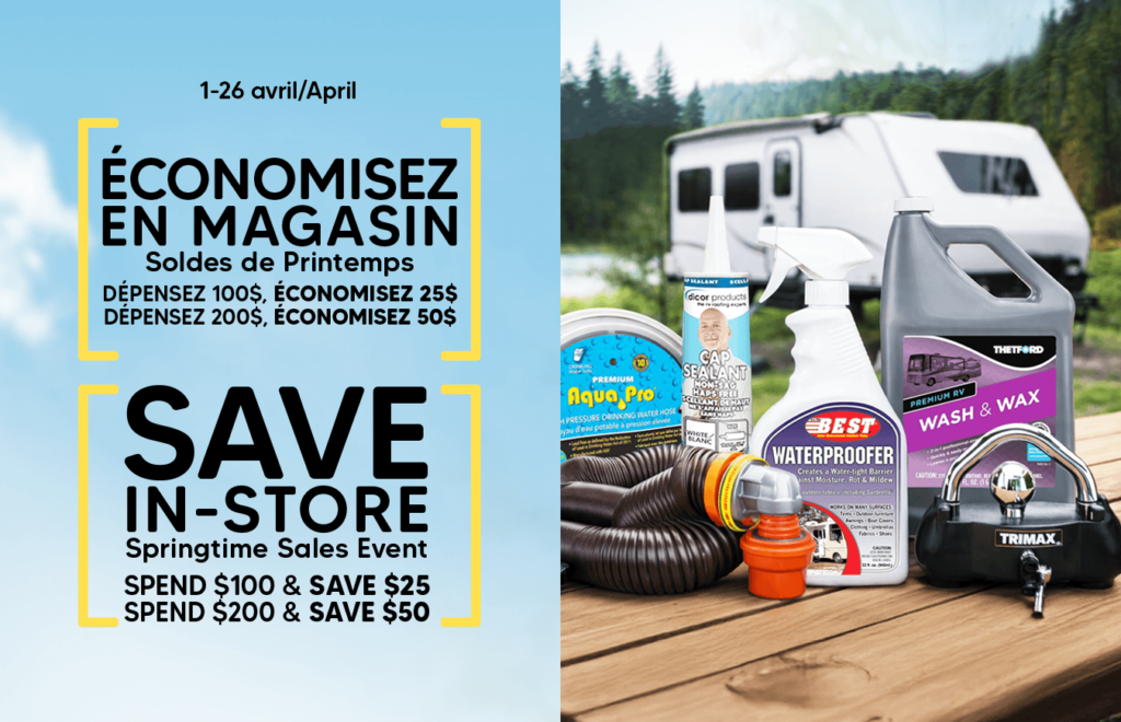 | Choisissez votre marque! Votre concessionnaire local RV Care offre une large sélection de produits fiables pour la saison. Achetez n’importe quel produit admissible – quelle que soit la marque – et faites des économies! • Nettoyants et cirages pour VR • Tuyaux d’arrosage pour VR (25 à 50 pieds) • Ensemble de tuyaux de vidange • Produits de traitement pour réservoirs d’eaux usées • Verrous pour attelages et accessoires • Scellants pour toit de VR • Trousses de déshivernisation • Nettoyants et protecteurs pour bornes de batterie *Exclut les batteries RVTC et les matelas. Ne peut être jumelée à aucune autre offre. Quantités limitées. |