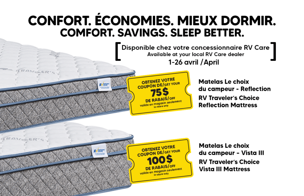 | Offre valide sur achat en magasin seulement, chez les concessionnaires participants et jusqu’à épuisement des stocks. Les prix réguliers peuvent varier d’un concessionnaire à l’autre. Rabais de 75 $ sur le matelas Le choix du campeur – Reflection ou rabais de 100 $ sur le matelas Le choix du campeur – Vista III sur présentation de votre coupon en magasin. Ne peut être jumelée à aucune autre offre ou promotion. |